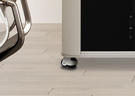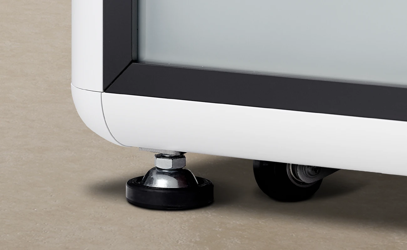 바퀴가 있어 이동 및 재배치가 가능합니다. 또한, 조절발을 통해 공간에 맞춰 고정 및 높이를 조절할 수 있습니다.