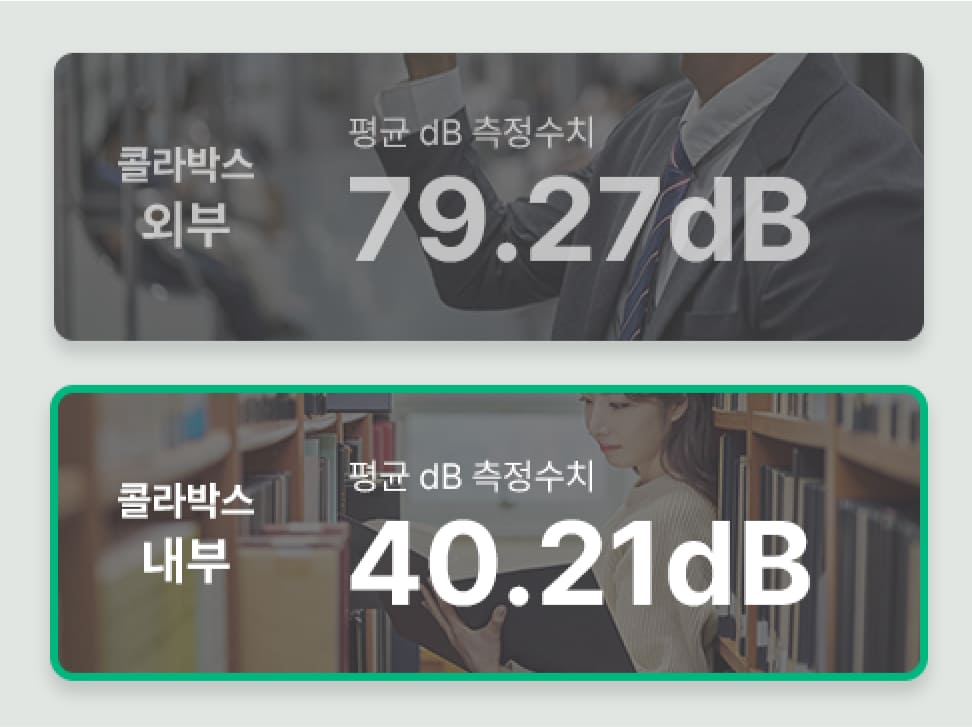 콜라박스는 특수 6중 방음 구조의 내장재를 사용하여 내부 소음을 효과적으로 감쇠시킵니다.